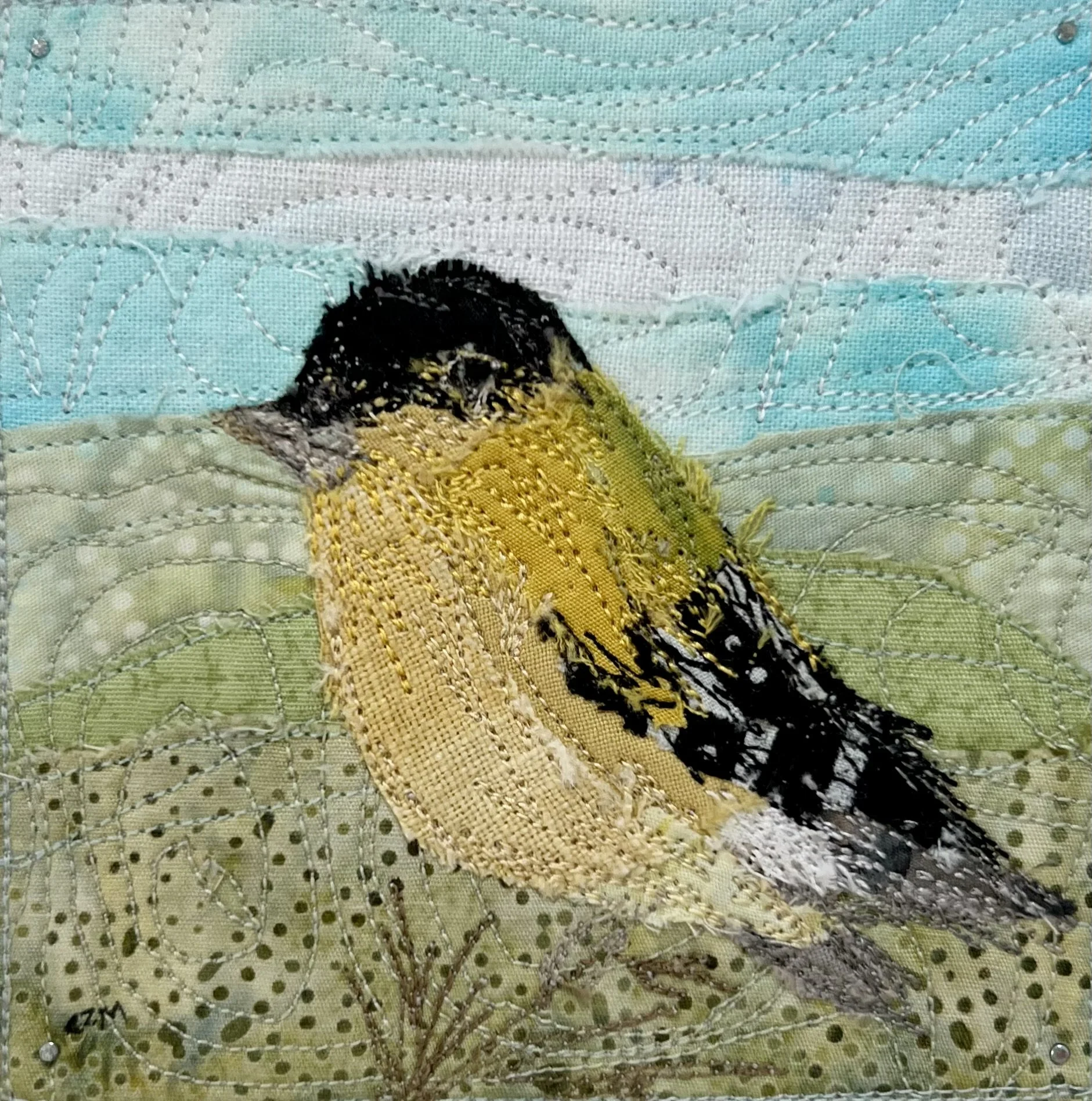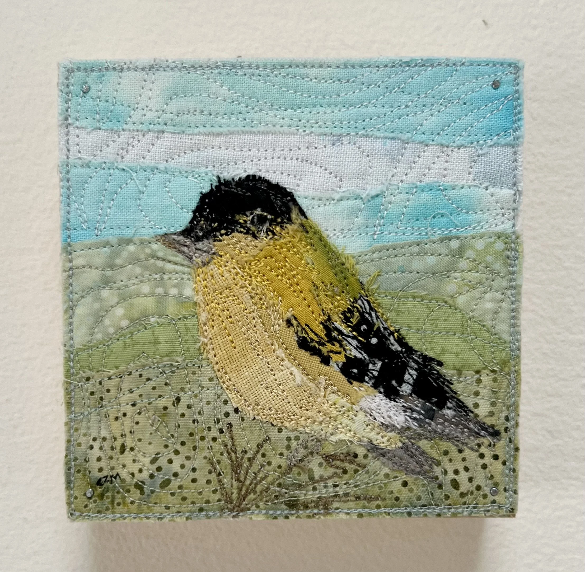 A sweet little goldfinch enjoying a spring day. This piece has lots of soft spring greens and blues in the background to contrast the bright yellow and black feathers of the goldfinch. Made with hand dyed cottons, linen and batik fabrics.
