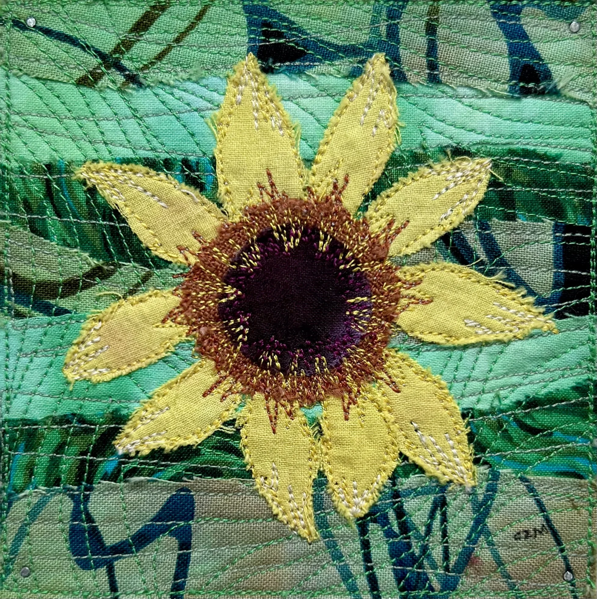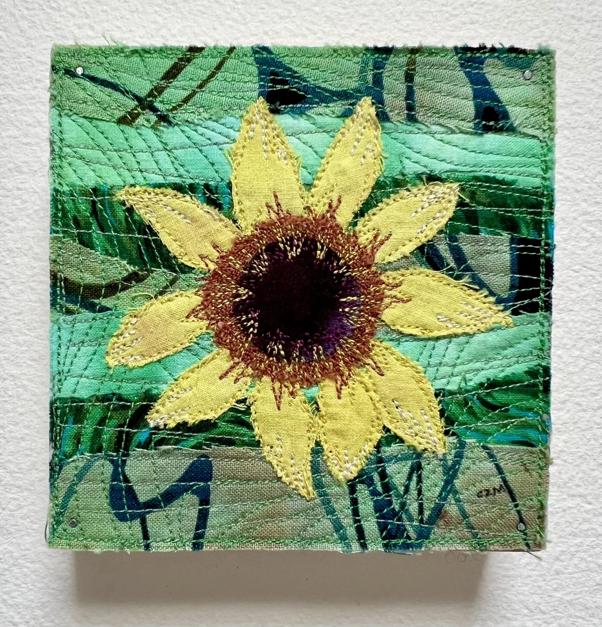 I love sunflowers, they grace my late summer garden and often appear in my art. This one is made with hand dyed cottons and linen, machine stitched and raw edge appliquéd.